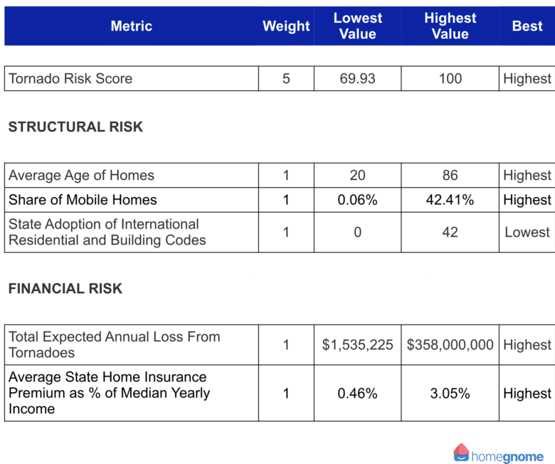 Using FEMA data, we analyzed nearly 950 counties with moderate to very high tornado risk. We considered six key factors, including tornado frequency, expected annual losses, average home age, and whether local building codes account for tornado resilience.