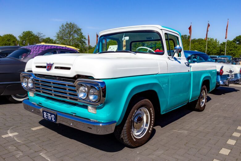 Boasting a vibrant turquoise and white two-tone paint scheme, this classic truck stands out for its iconic front grille and characteristic rounded headlights. As part of Ford’s third-generation F-Series, the F100 was renowned for its improved power, style, and utility. A reliable workhorse, yet stylish enough for a weekend drive, this particular model captures the essence of the late 1950s automotive design, where function met flair on the open road. The gleaming chrome details and robust stance are testaments to Ford’s dedication to craftsmanship during this era.