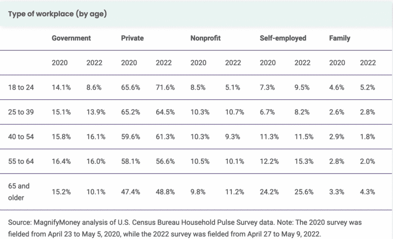 - More than a quarter of working Americans 65 and older are self-employed. 25.6% of employed older Americans are self-employed — more than triple the rate among working Americans 25 to 39. Meanwhile, the government isn’t the landing spot it once was for older workers: In April and May 2020, 15.2% of employed Americans 65 and older worked for the government. In April and May 2022, however, that percentage plummeted by a third to 10.1%.