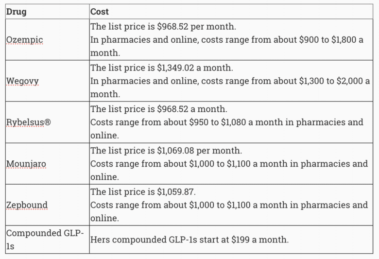 • Brand name GLP-1s, like Ozempic and Wegovy, cost around $1,000 to $2,000 a month.