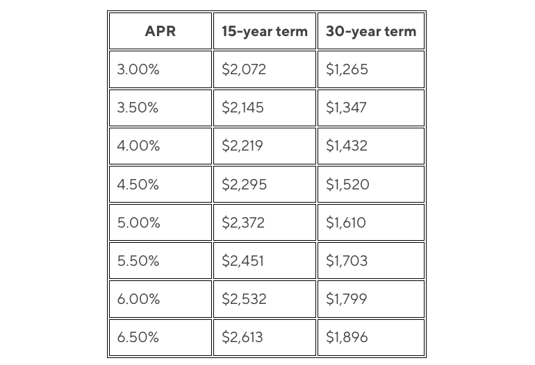 For example, suppose you secure a 30-year fixed $300K mortgage at 4.5% APR. In this case, the monthly payment would be $1,520. On the other hand, if you have a 15-year fixed $300K mortgage at 4% APR, the monthly payment would be $2,219. As you can see, APR and terms can have a big impact on your monthly mortgage payment. (Learn more at 15-Year vs 30-Year Mortgage: Which Should You Choose?).