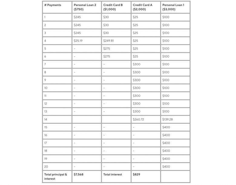 Just like with the snowball, you pay off one debt and then put the money you were paying on that debt toward the loan or card with the next highest interest rate until it’s all paid off.