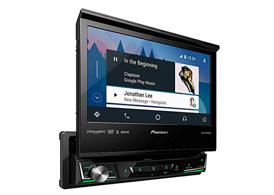 This single-DIN unit from Pioneer is a more compact head unit with a seven-inch touchscreen which flips out. There’s Apple CarPlay and Android Auto support, as well as Bluetooth for streaming music to your stereo from another device. The user interface is customizable, and there’s a disc slot for CDs and DVDs, plus satellite radio, and a USB port.