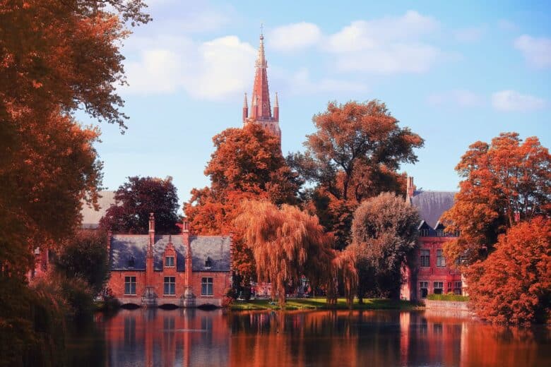 Brugge offers small-town fall vibes with a red color palette.The changing colors of the leaves look spectacular against the backdrop of the old buildings and walking trails.