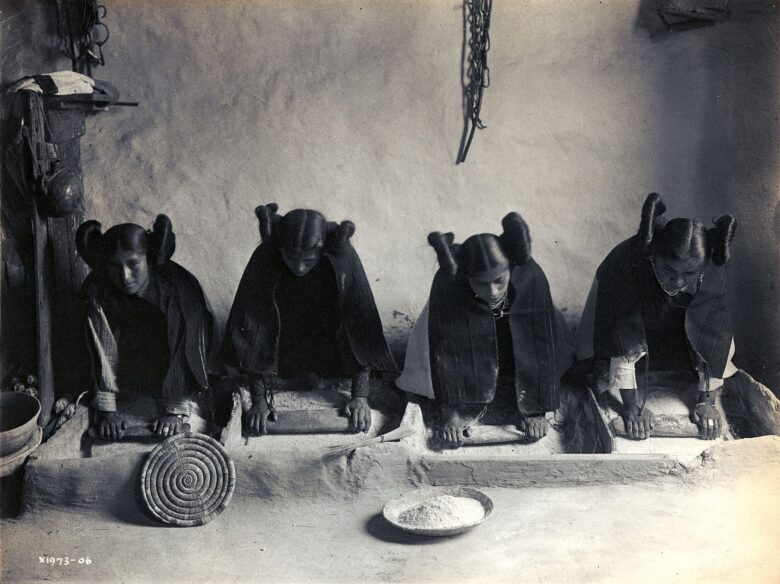 In the arid landscapes of the Southwest, Curtis was introduced to the Hopi. One of the most iconic images Curtis captured of the Hopi is of a young woman, exemplifying the unique “squash blossom” hairstyle, a coiffure traditionally worn by Hopi maidens.