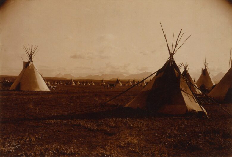 The tepees, conical structures tailored for nomadic lifestyles, not only served as shelters but also symbolized familial units, traditions, and tribal identity. Set against the towering majesty of the mountains, these tepees underscore the deep-rooted connection tribes maintained with the land.