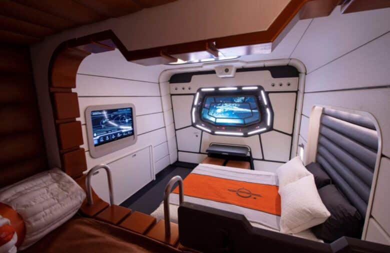 Star Wars: Galactic Starcruiser room choices include Standard Cabins for up to five passengers; Galaxy Glass Suites, one-bedroom suites for up to four passengers with a living space; and Grand Captain Suites, two-bedroom suites sleeping eight passengers and featuring two bathrooms, a bar area and three windows out into space.