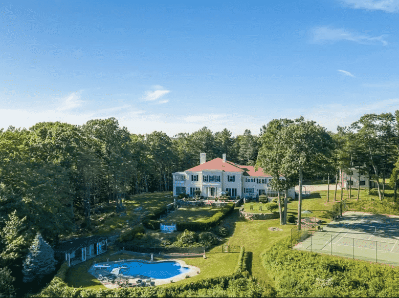 This luxurious property sits on 85 park-like acres in prestigious Greenwich. Truly immersed in nature,  it includes even including beautiful organic gardens, a tennis court, baseball diamond, an outdoor pool with a water slide and an indoor lap pool.