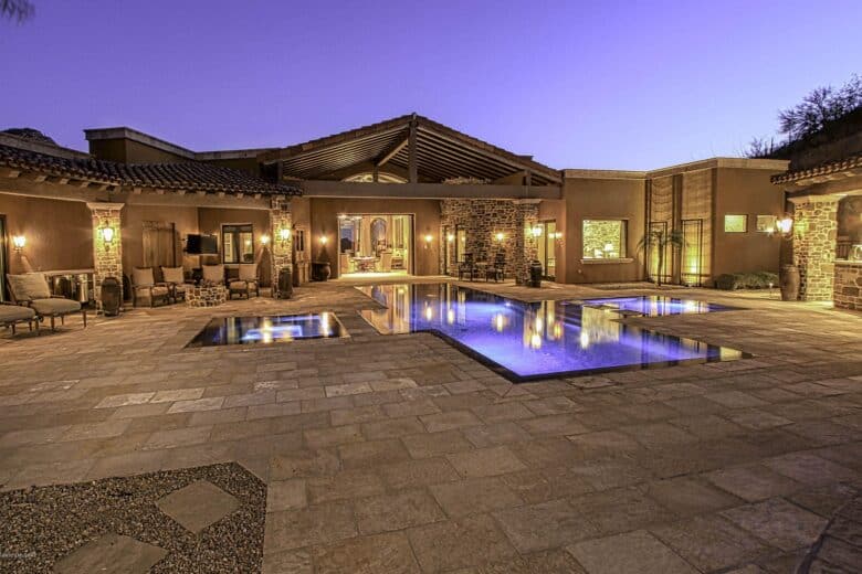 Located inside of a private, gated community, this gorgeous home even includes an indoor rock climbing wall and a wine cellar. The outdoor pool area also includes a fully-equipped kitchen and dining areas as well as a barbeque.