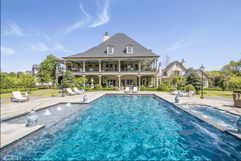This Greek Antebellum Revival home is 22,000 square feet of luxury. It comes with a  beautiful pool, tennis court, wine cellar and more. The grand foyer’s three-story staircase and oversized embassy entertainment rooms will transport you back in time.