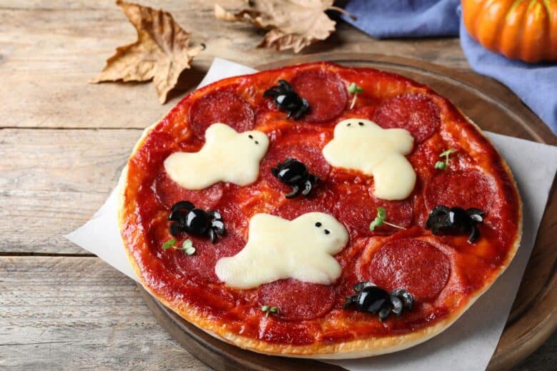 Mini spider pizzas are a quick and easy Halloween appetizer! Just buy frozen pizza bagels and top them with a spider made out of olives.