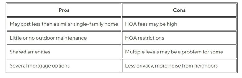You’ll share walls with other residents but will own your unit. That means you’ll be in charge of the repairs and upkeep on the interior, but you won’t have to worry about lawn maintenance, cleaning and fixing the pool, or exterior repairs. (You’ll likely pay a monthly or quarterly fee to cover those costs, though).