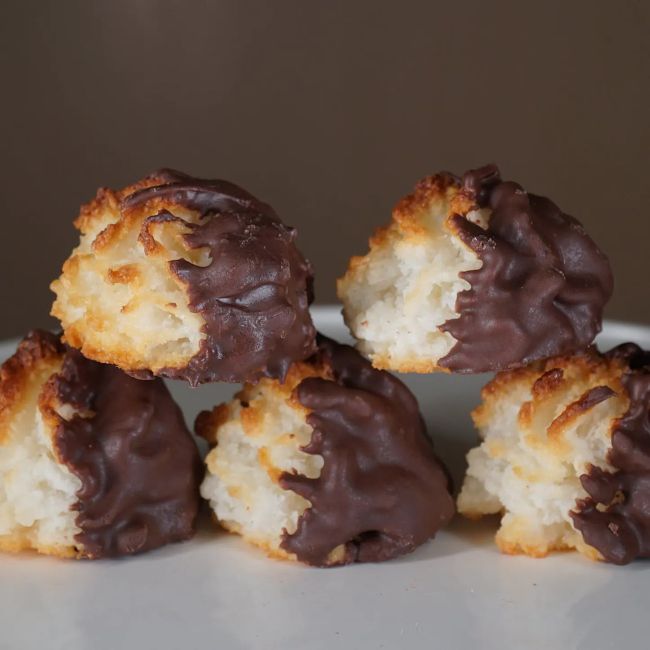 Macaroons are chewy coconut cookies made with strands of fresh coconut. The cookies are formed into bite-size balls or mounds. These two-bite cookies are crispy on the outside and chewy on the inside.