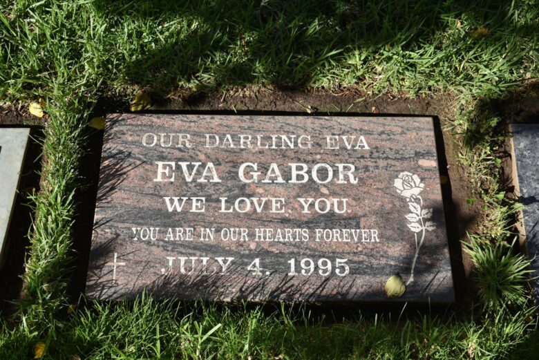 Eva Gabor (1919–1995), actress. Hungarian-born actress and socialite who starred in the popular TV sitcom, Green Acres; sister to Zsa Zsa and Magda Gabor. She is buried a few feet away from her Acres co-star Eddie Albert.