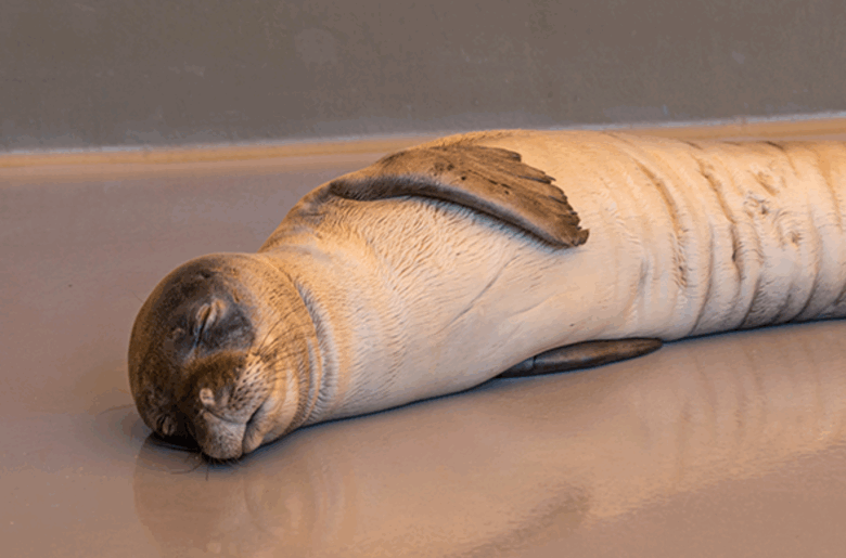 In the spring of 2017, NOAA crews stationed at French Frigate Shoals in the Northwestern Hawaiian Islands discovered a severely weak and malnourished pup, ‘Awapuhi, on Gin Island. The picture is for the seal pup resting just before the team transferred her to NOAA ships for transport to The Marine Mammal Center.