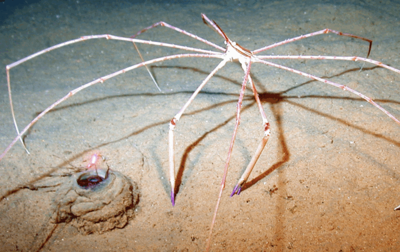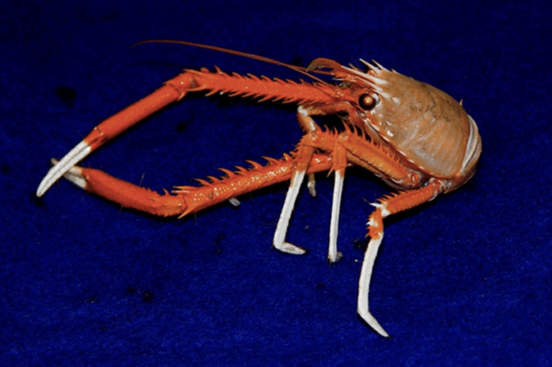 A crab with a single visual pigment. The Galatheid crab is a small, deep-sea crustacean with a bent tail, found near hydrothermal vents.