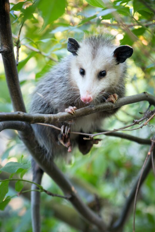 Opossums don’t nest in trees, but they’re adept climbers who scramble into the canopy to escape predators or to find a snack.
