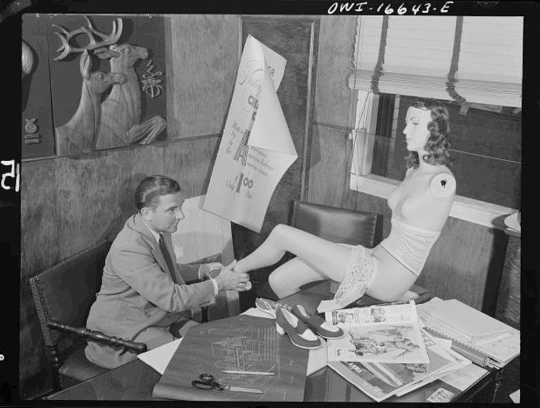 Head of the art department with new model at the Crowley-Milner department store.