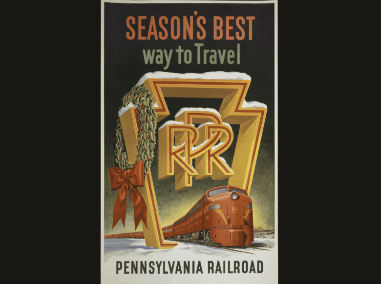 Season’s best way to travel, travel poster, Pennsylvania Railroad, 1955.