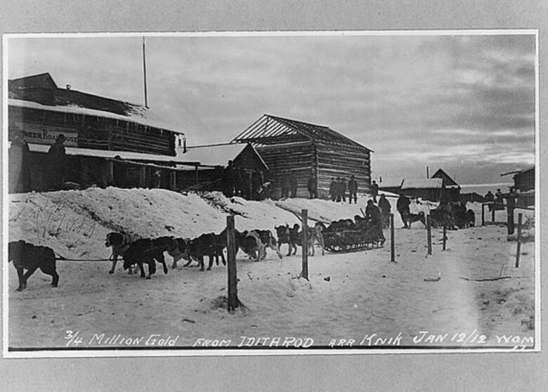 Photo shows the Iditarod Trail in Knik, Alaska, with two of the dog teams that carried gold bullion south from the goldfields. 1912.