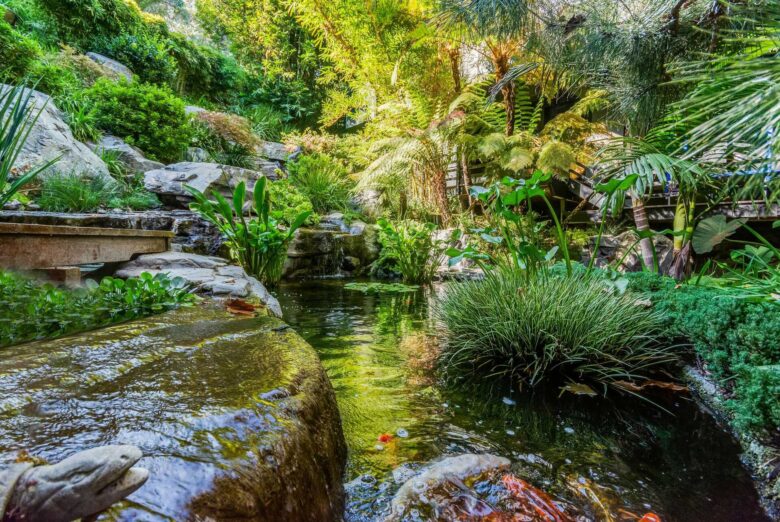 With its cascading gardens of trees, unique plants, ferns, bamboo, extensive stonework, magical pathways, waterfalls, herb garden and Koi pond, the property is a true oasis. There’s also an authentic Japanese teahouse on the property.