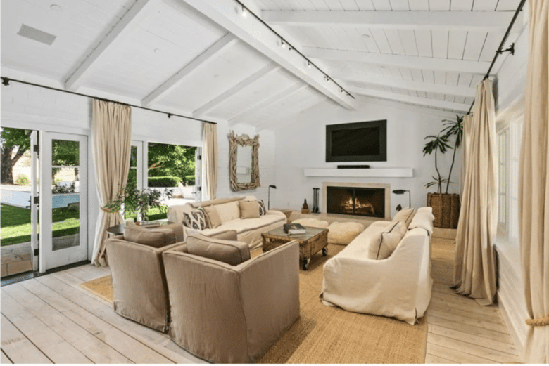 Sandra Bullock’s house has 4 bedrooms and 6 baths, a large living room with high-pitched white wood ceilings, and a library with fireplace and illuminated shelving.
