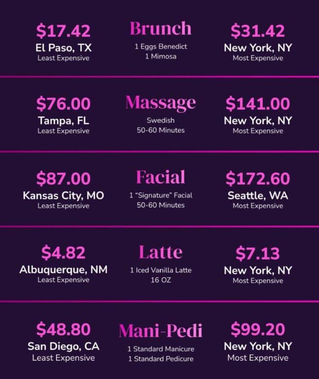 To rank the most and least expensive cities for self-care, we found the average prices for six activities—brunch, massage, facial, iced latte, manicure, and pedicure—across the 50 most populated U.S. cities. We analyzed 1,750 price points from top businesses’ websites and online menus. We then added up the prices for each city to determine the overall costs of a self-care day and built our list from there.