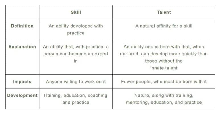 This chart overviews the key differences between skill and talent, including their definitions, how they’re developed, and examples.