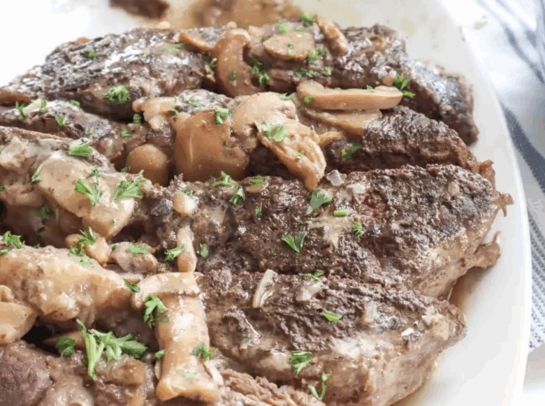 Cube steak cooks low and slow in a mushroom-onion gravy that’s rich but not too heavy. You can skip the canned soups because this version uses real ingredients. It’s an easy dinner that goes great with mashed potatoes or egg noodles. Plus, prep takes less than ten minutes.
