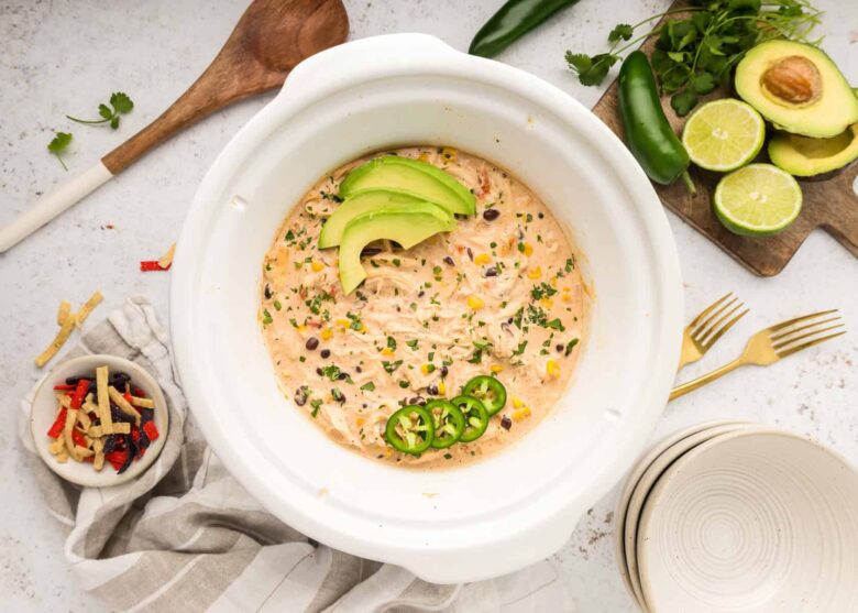 This chili features white beans, corn, and shredded chicken in a mild, creamy broth. It’s one of the easier crock pot recipes you can pull together without much chopping. You can toss everything in by lunchtime and enjoy it by dinner. It’s also freezer-friendly, which is helpful for leftovers.