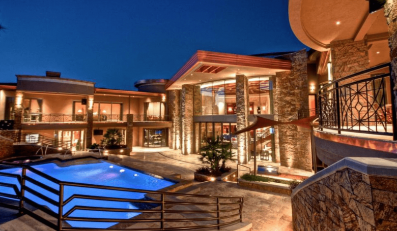 Special Features: This glistening property features luxury as far as the eye can see — from the lighted outdoor pool to the two-story library and a living room that looks like a casino. There’s also a home theater, wine cellar, wet bar and much, much more.