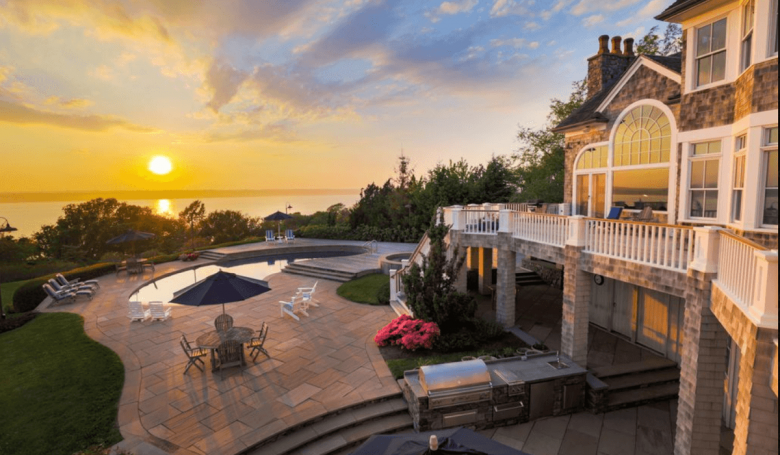 Special Features: Another peninsula home, this one features an indoor and outdoor pool, a tennis court, home theater, and spanning water views. The home’s six acres is situated on Long Island Sound.