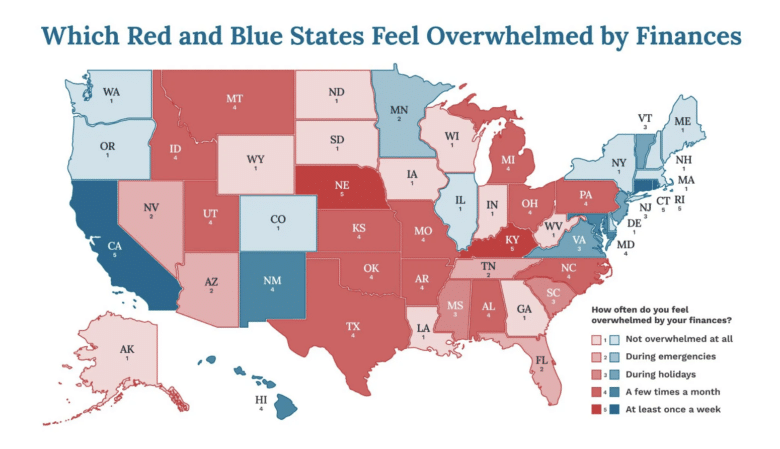 • Those in more right-leaning conservative states — “red” states — were twice as likely to feel overwhelmed by debt a few times a month.
