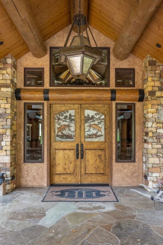 The light fixtures were custom-made in Utah, the entryway light fixture was handcrafted in Alaska, and Indiana bedrock was used for the fireplaces in the breakfast room, great room, and screened-in porch, as well as to decorate portions of the exterior.