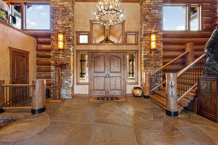 The luxurious log home is built from lodgepole pine sourced from the Northern Rockies, and the meticulously sourced materials continue through to the floors made up of white oak, red hardwood, and stone from Texas.