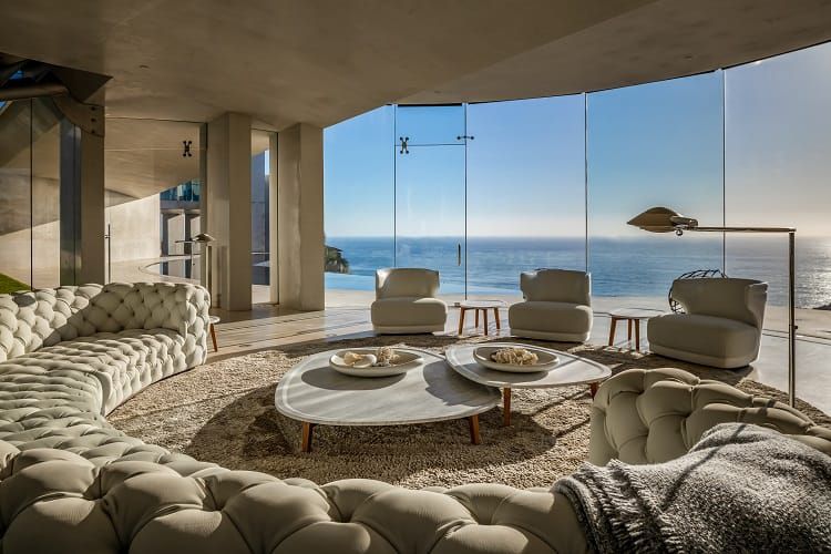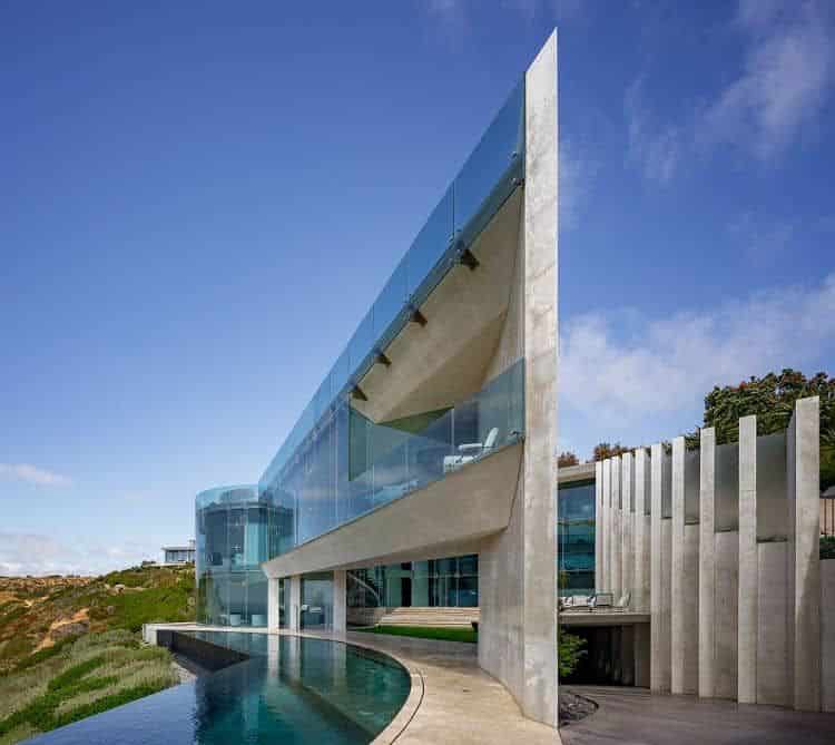 The imposing concrete and glass mansion is perched on the edge of a cliff overlooking the Pacific Ocean.