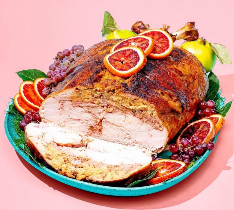 - The turkey, duck, and chicken are all deboned. Some choose to keep the turkey wings and ends of the turkey leg bones intact, so after it’s roasted it still resembles a turkey.