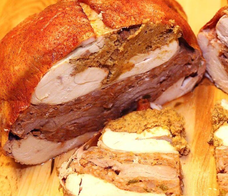 First, a little history. Cajun chef Paul Prudhomme helped popularize the Turducken –– defined by the USDA as “a deboned stuffed chicken inside a deboned stuffed duck inside a deboned stuffed turkey”–– but its actual inventor was a Cajun butcher shop called Hebert’s Specialty Meats in Maurice, Louisiana; owners Junior and Sammy Hebert claim that they created it in 1984 upon an enterprising customer’s request.