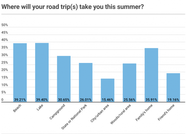 For those that do decide to travel this summer, likely road trip destinations include the lake (39%), the beach (39%), and a family member’s home (36%).