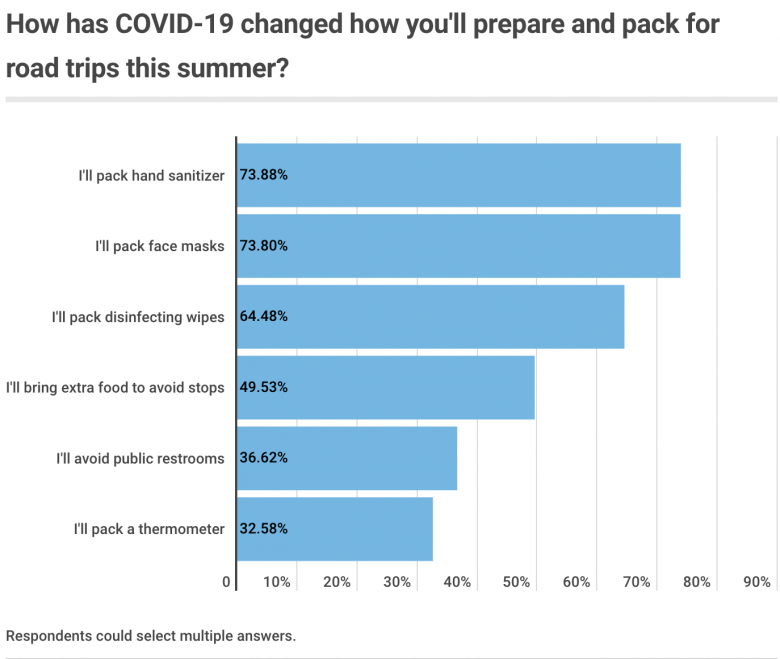 We’ll see more than just bathing suits and sunscreen on travelers’ road trip packing lists this year as well. People plan to pack protective items to keep themselves safe; 74% plan to pack hand sanitizer, 74% plan to pack face masks, and 64% will pack disinfecting wipes.