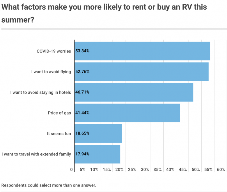 COVID-19 worries are driving RV popularity: 53% said they want an RV to avoid flying, and 47% said they want one to avoid hotels. The low price of gas was also an important factor for 41% of people.
