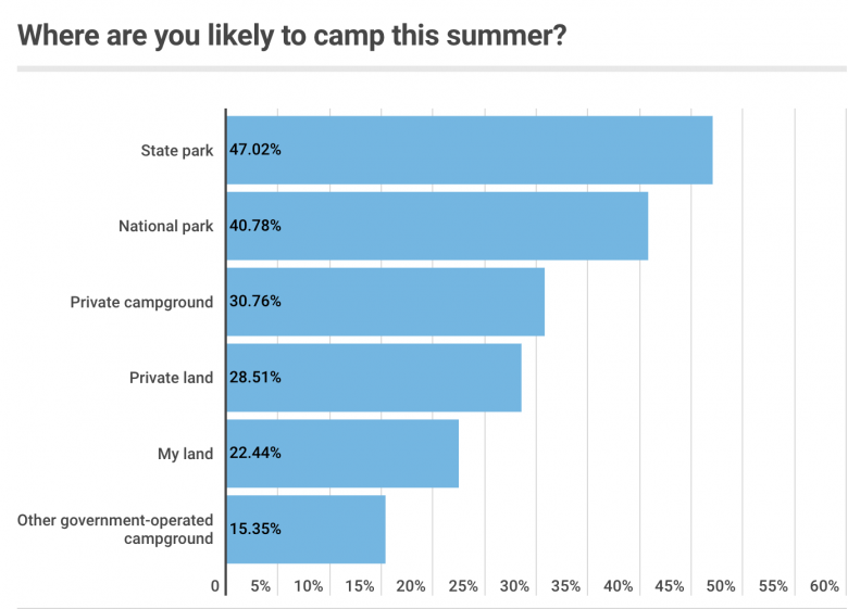 As a result, expect state and national parks to be crowded. Forty-seven percent of campers plan to stay at a state park, and 41% expect to camp at a national park. Not only do these parks feature idyllic camping grounds, but the entrance fees have been waived for the time being.
