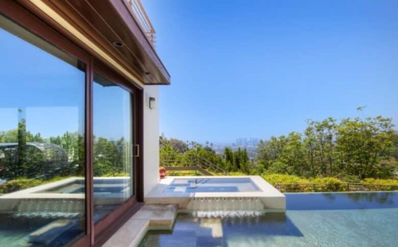 With a total of 6 bedrooms and 6 baths, the glam estate with a 90210 zip code spans 4,675 square feet. The rooms are grand in scale, with the living areas open and flowing, creating harmony with the home’s spectacular pool and abundant outdoor spaces.
