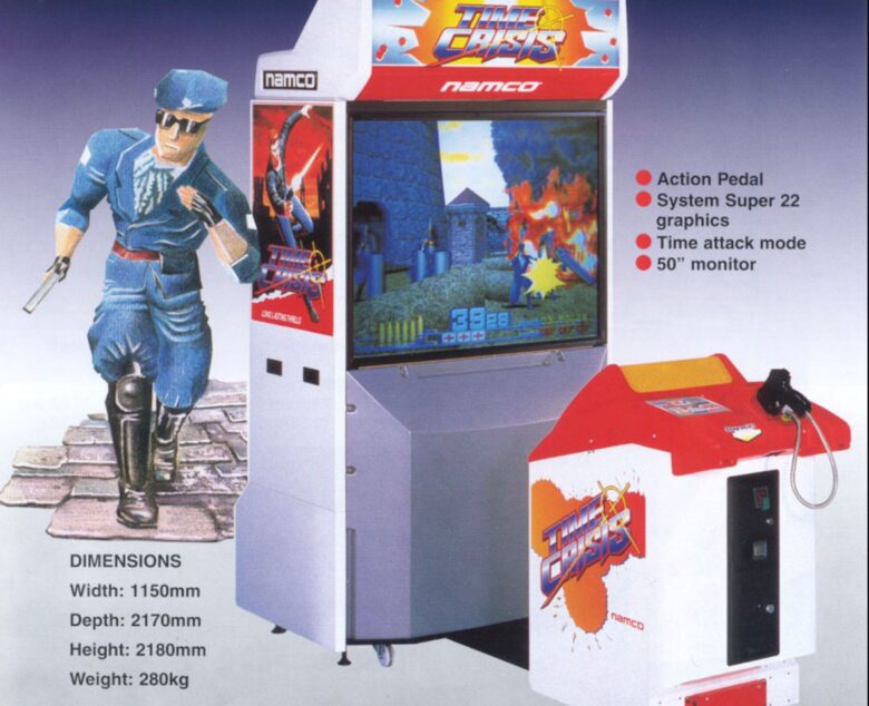 Time Crisis is a first-person shooter that came out in 1995. As a light gun shooter, this game used gun-shaped controllers to allow players to aim and fire at targets on the screen. Time Crisis was one of the first games that allowed players to reload their weapons and to use cover as a game mechanic.