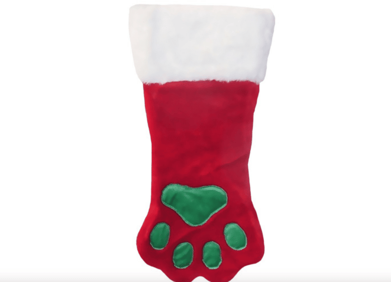 The Kyjen Outward Hound dog Christmas stocking in size small costs $9.39 (or you can get a larger size for $12.35). This paw-shaped stocking with a white and fuzzy cuff and green embroidered paw print is cute for a cat, too.