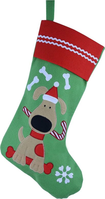 The Glitzhome 21-inch dog Christmas stocking lights up and has the word “WOOF” embroidered on the stocking’s cuff. It costs $15.46 and has 4.7 out of 5 stars among over 1,100 ratings on Amazon. It does require three AA batteries for the LED lights on it to work.