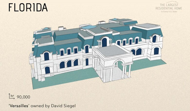 While construction on the megamansion known as Versailles stalled after five years in 2009 amidst the Great Recession, the 90,000-square-foot estate is still the largest single-family home in Florida. The Lake Windermere home features 11 bedrooms, 22 bathrooms, five kitchens, and a 35-car garage and was the subject of the 2012 documentary “The Queen of Versailles.”