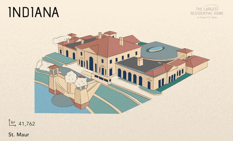 Sitting on 150 acres of Indianapolis land that once belonged to the Benedictine Monastery of St. Maur, Indiana’s largest home features 61 rooms, a variety of gardens, imported trees, and a host of sculptures. In January 2022, the property was listed for $14 million.