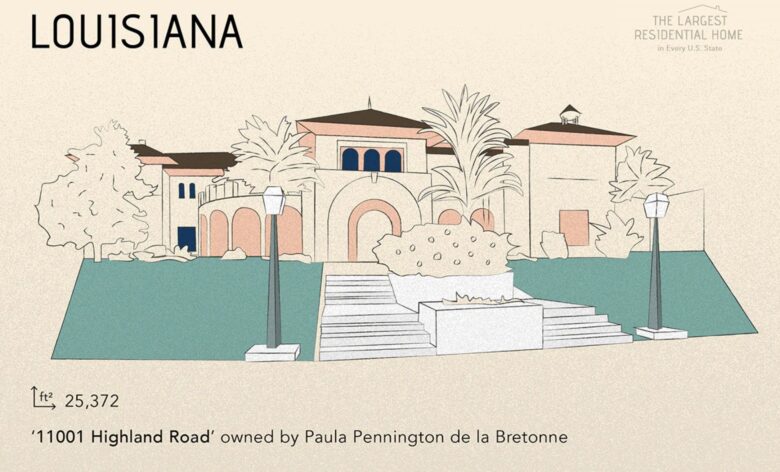 The mansion at 11001 Highland Road in Baton Rouge was built in 2006 and sports five bedrooms, 10 bathrooms, a home theater, gym, cabana, saltwater pool, manmade lake, and four-bedroom cabana across 12.5 acres of land. As of May 2022, the property is on sale for $14 million.