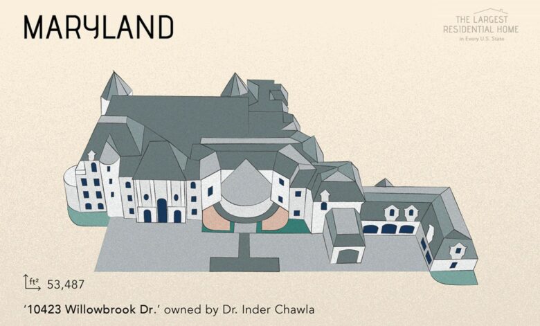 One of the newer homes to rank as the largest within a state, the mansion at 10423 Willowbrook Drive was built in 2017 on five acres of land. At 53,487 square feet, the sprawling estate dwarfs its two nearest neighbors, which span 5,805 square feet and 12,906 square feet, respectively.